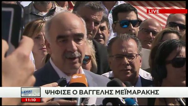 «Πιστεύω ότι οι πολίτες θέλουν να διώξουν το γκρίζο, το ψέμα, τους δήθεν. Για να έχουμε ένα καλύτερο αύριο. Μπορούμε να έχουμε ένα καλύτερο αύριο. Απόψε το βράδυ, όλοι οι Έλληνες θα γιορτάσουμε τη νέα Ελλάδα που θα έχουμε από την Δευτέρα, με χαμόγελο» δήλωσε ο Β. Μεϊμαράκης, μετά την άσκηση του εκλογικού του δικαιώματος.