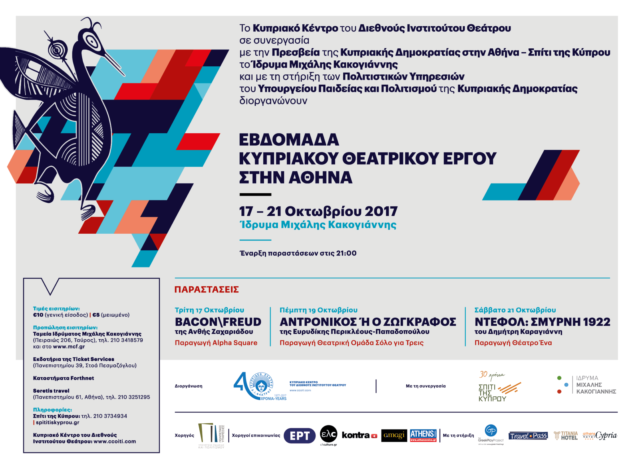 Το Κυπριακό Κέντρο του Διεθνούς Ινστιτούτου Θεάτρου (ΚΚΔΙΘ), σε συνεργασία με το Μορφωτικό Γραφείο της Πρεσβείας της Κυπριακής Δημοκρατίας στην Αθήνα, Σπίτι της Κύπρου και το Ίδρυμα Μιχάλης Κακογιάννης, διοργανώνει την «Εβδομάδα Κυπριακού Θεατρικού Έργου στην Αθήνα», η οποία θα πραγματοποιηθεί από τις 17 μέχρι τις 21 Οκτωβρίου 2017, στο Ίδρυμα Μιχάλης Κακογιάννης.