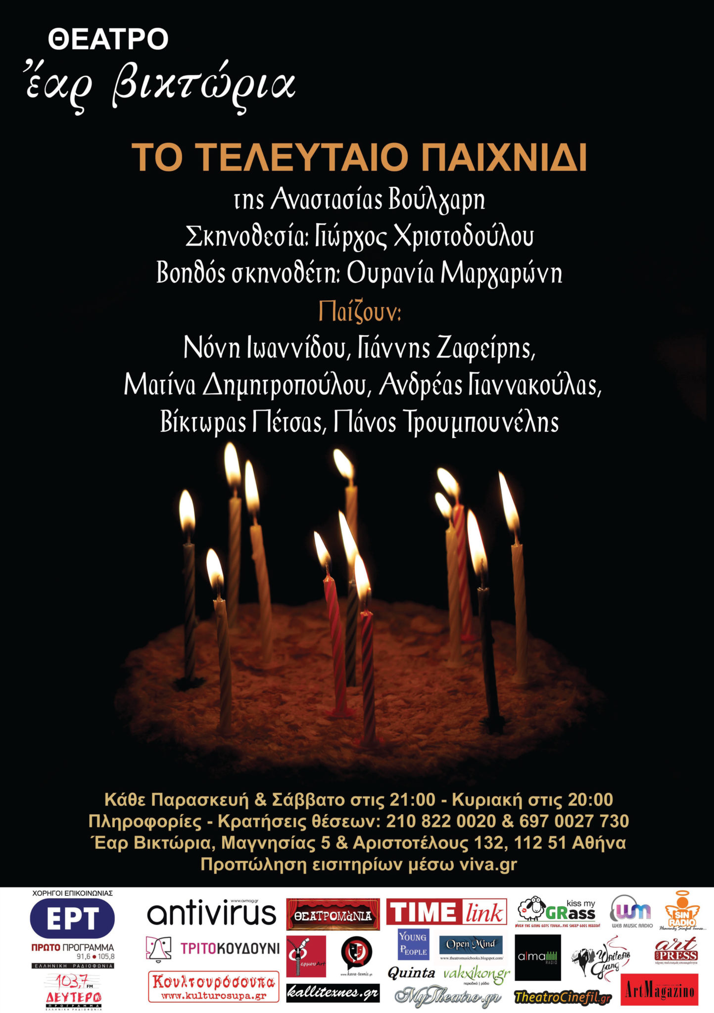 Το Θέατρο Έαρ Βικτώρια παρουσιάζει, από 12 Ιανουαρίου 2018 στην κεντρική σκηνή, το νέο έργο της Αναστασίας Βούλγαρη «Το τελευταίο παιχνίδι».