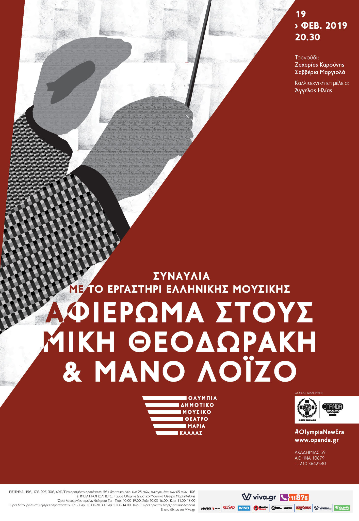 Την Τρίτη 19 Φεβρουαρίου 2019 στις 20.30, η σκηνή του Ολύμπια, Δημοτικό Μουσικό Θέατρο Μαρία Κάλλας θα γεμίσει με τις μελωδίες των Μίκη Θεοδωράκη και Μάνου Λοΐζου.