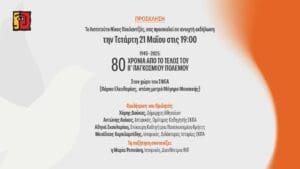 Το Ινστιτούτο Νίκος Πουλαντζάς στο πλαίσιο της επετείου των 80 χρόνων από τη λήξη του Β’ Παγκοσμίου Πολέμου, διοργανώνει εκδήλωση, για το γεγονός που σημάδεψε την σύγχρονη ιστορία της ανθρωπότητας, με θέμα: ‘’1945-2025 80 χρόνια από το τέλος του Β’ Παγκοσμίου Πολέμου’’. Η εκδήλωση θα πραγματοποιηθεί την Τετάρτη 21 Μαΐου και ώρα 19:00, στο Πάρκο Ελευθερίας (στάση Μετρό Μέγαρο μουσικής), στο χώρο του ΣΦΕΑ.